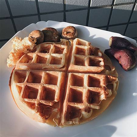 早上我很有良心的起床幫忙煎啾喜的蘑菇和美式炒蛋,妹妹操作鬆餅機,分工下用這格子煎餅迎接晨曦,2018的第一⋯⋯個太陽,因為第一道曙光是來不及了。